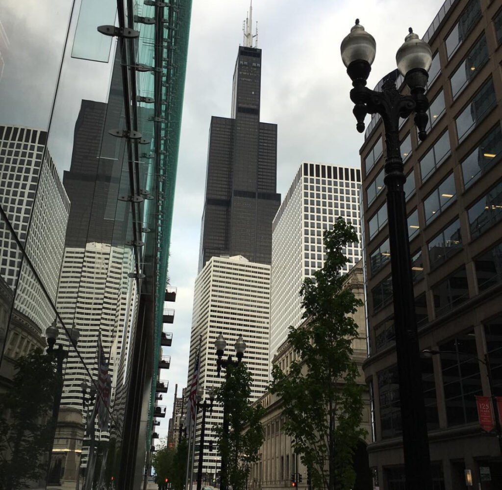 I worked 3 blocks from the Sears Tower. One day after work I turned and saw this awesome mirror of the tower